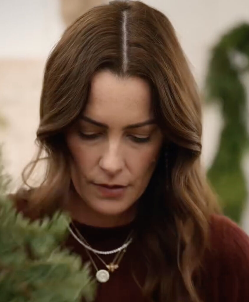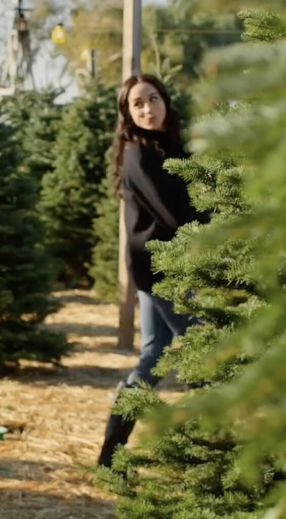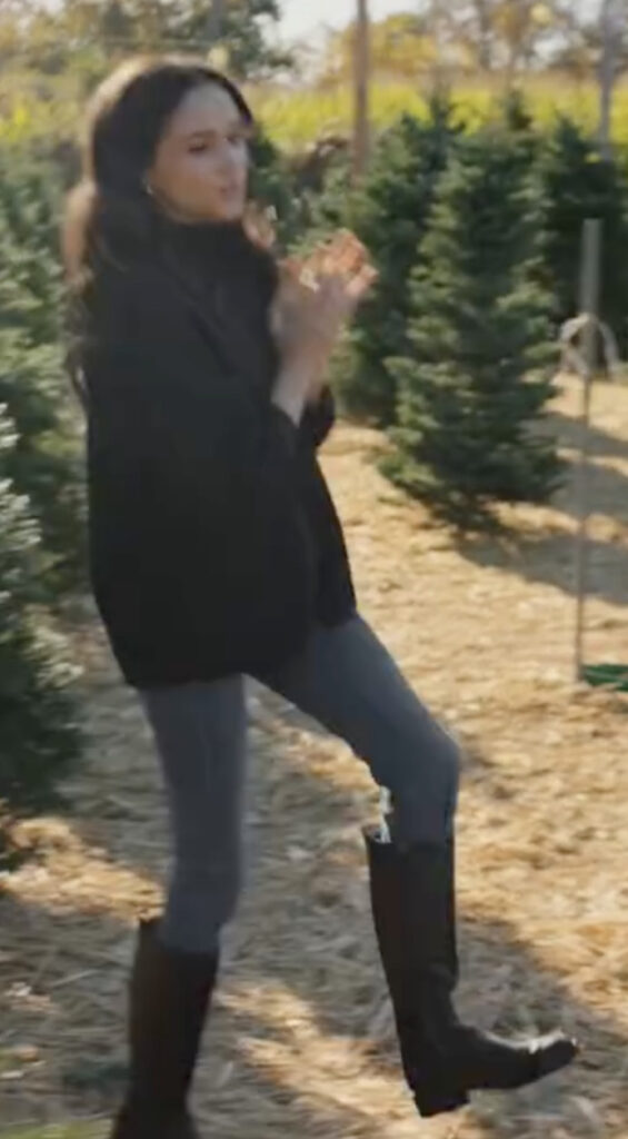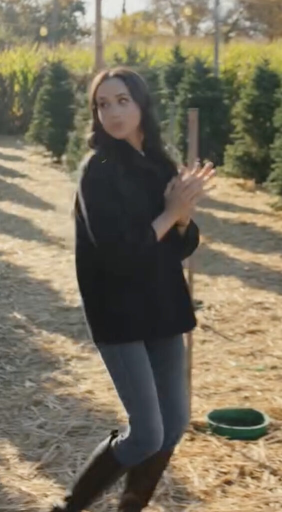 Visually, the special leans into the warmth of Montecito during the holidays. We see Meghan picking out a Christmas tree in jeans and boots, then later hosting in a silky emerald-green gown that’s festive without being too flashy — a very Meghan balance.