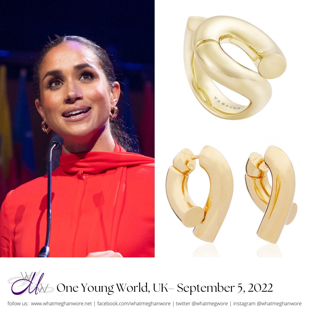 While we don’t have clear images of her earrings, it’s possible she wore her Tabayer ‘Oera’ gold pair, $2890. She first wore them for the 2022 One Young World event (shown below).