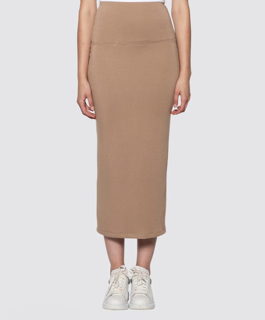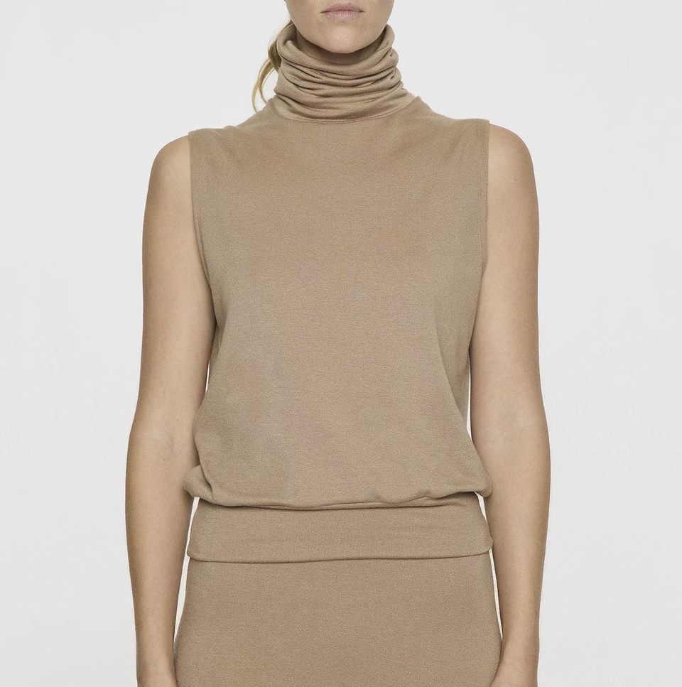 For the appearance, Meghan wore separates by Bleusalt. Their Sleeveless Turtleneck, $140 and their Tube Skirt, $162 both in camel.