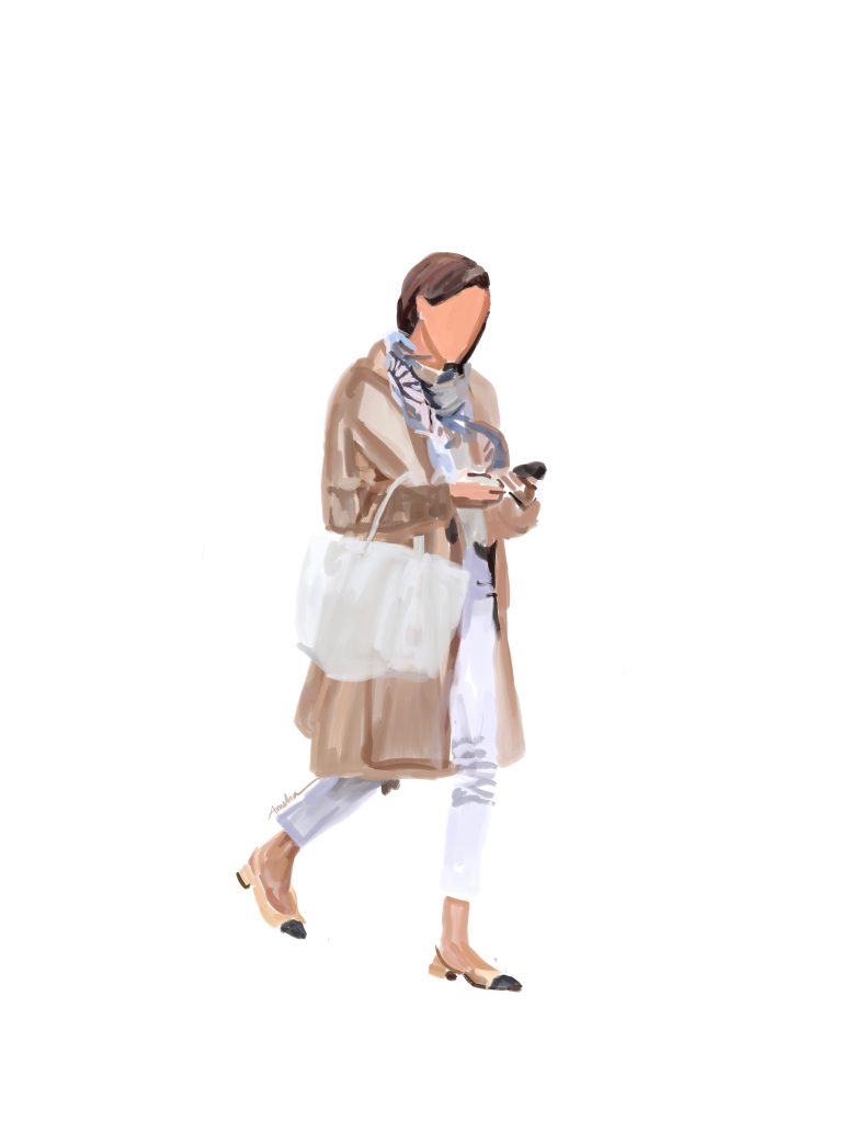 She paired the coat with a new scarf from Hermes, the ‘Rayures D’Ete’ shawl scarf, $1,225 along with her Goyard ‘St. Louis GM’ bag, $1,825 and a new pair of Chanel cap-top sling-back flats in beige/black.