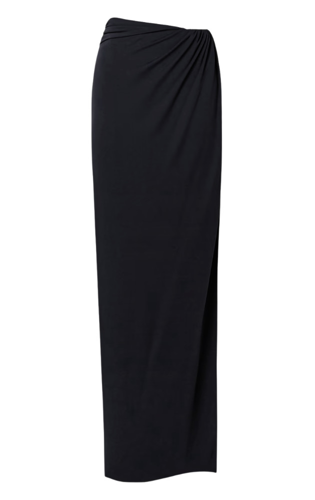 UPDATE 11/11: Her skirt is from Brandon Maxwell — Wrap-effect Gathered Jersey Maxi Skirt, $1795 (no longer available).