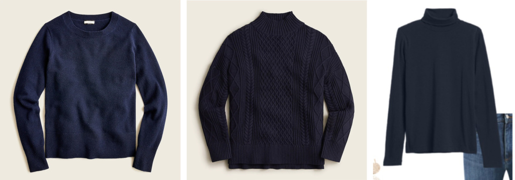 From J Crew – Cashmere crewneck sweater, reg. $118 NOW $69 / Cable Knit Mock-Neck Sweater, $138 and from Banana Republic – the timeless turtleneck, $21.