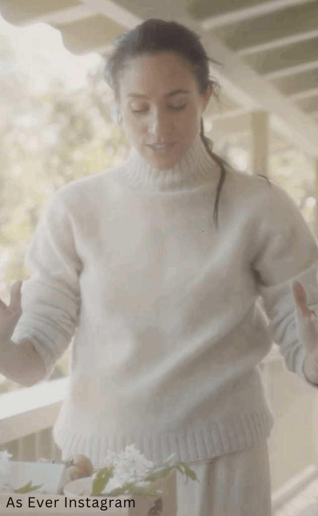 Meghan is wearing her Brochu Walker ‘The Everyday Cashmere Bright Crew’ in Bisque Mélange, $428.