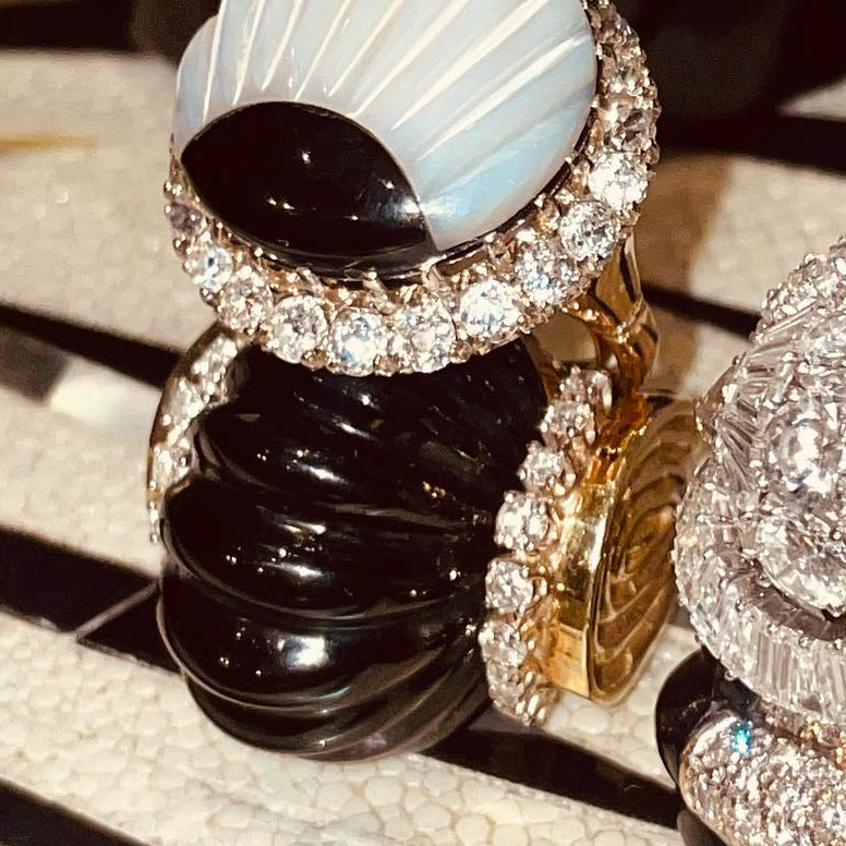 UPDATE 2/10: Meghan wore vintage pieces from Maison Mèrenor — onyx and diamond pendant earrings and a fluted bombe ring, both circa 1970s.