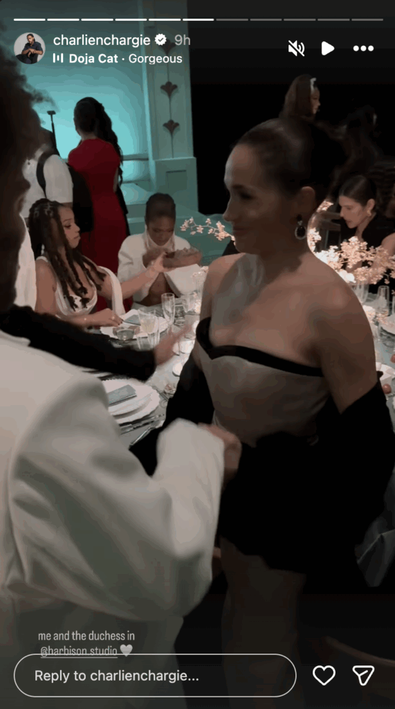 From Charlie Harbison’s Instagram stories — the designer chats with Meghan at the event.