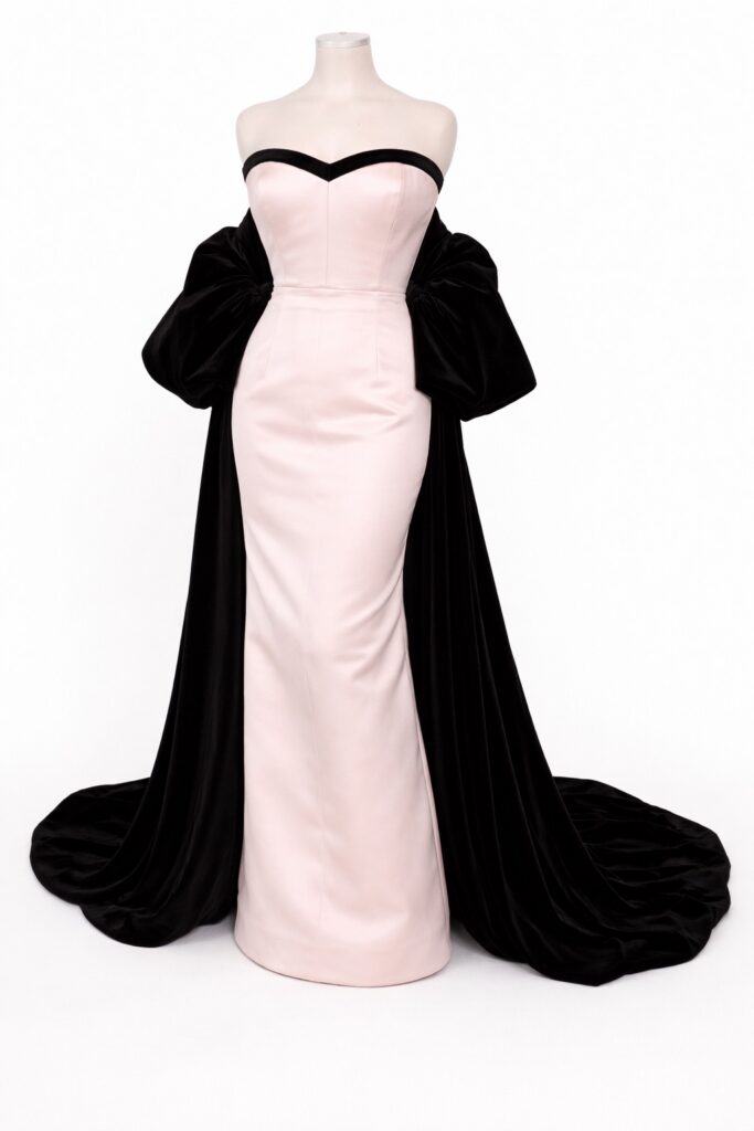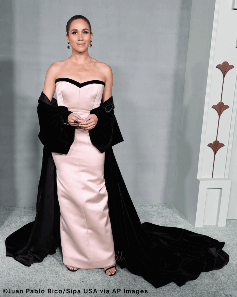 For the gala, Meghan embraced a vibe that felt straight out of classic Hollywood. She stepped out in a custom oyster-colored strapless column gown by Harbison Studio. The minimalist yet bold silhouette was finished with black piping at the sweetheart neckline and a dramatic black velvet and silk shawl that trailed elegantly behind her. She paired the look with her Stuart Weitzman sandals and statement earrings.