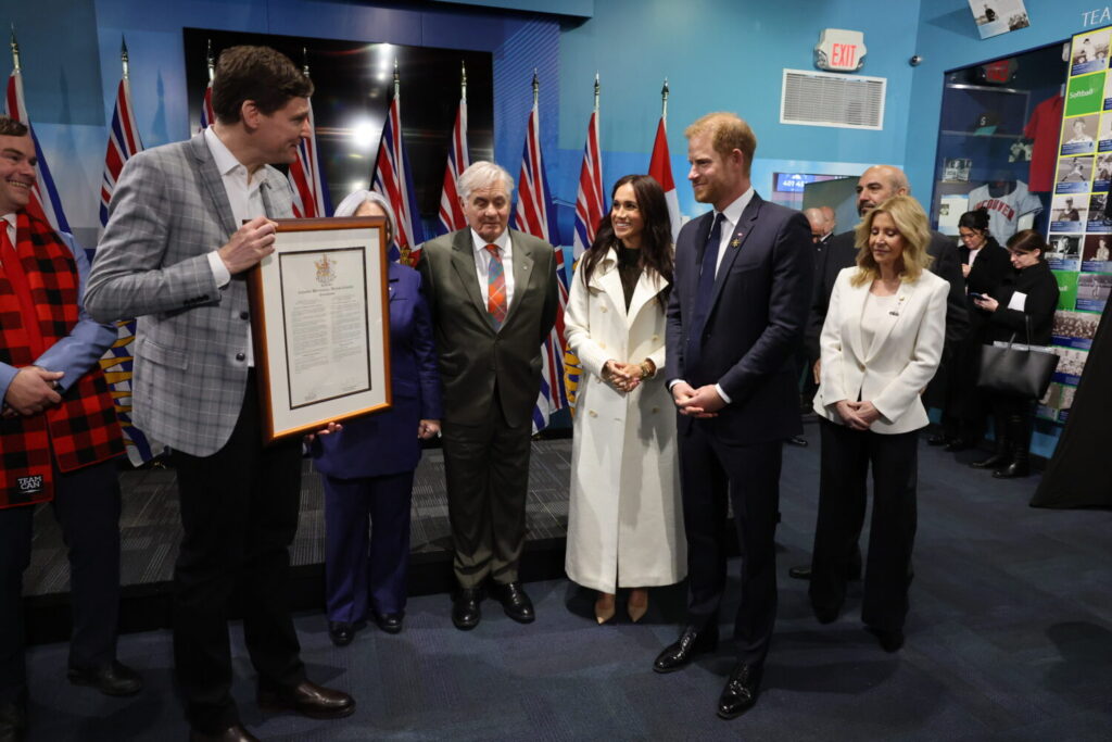 Harry and Meghan with Hon. David Eby, Premier of British Columbia, Honourable Mary Simon, Governor General of Canada, Excellency Whit Grant Fraser back stage at the opening ceremony.