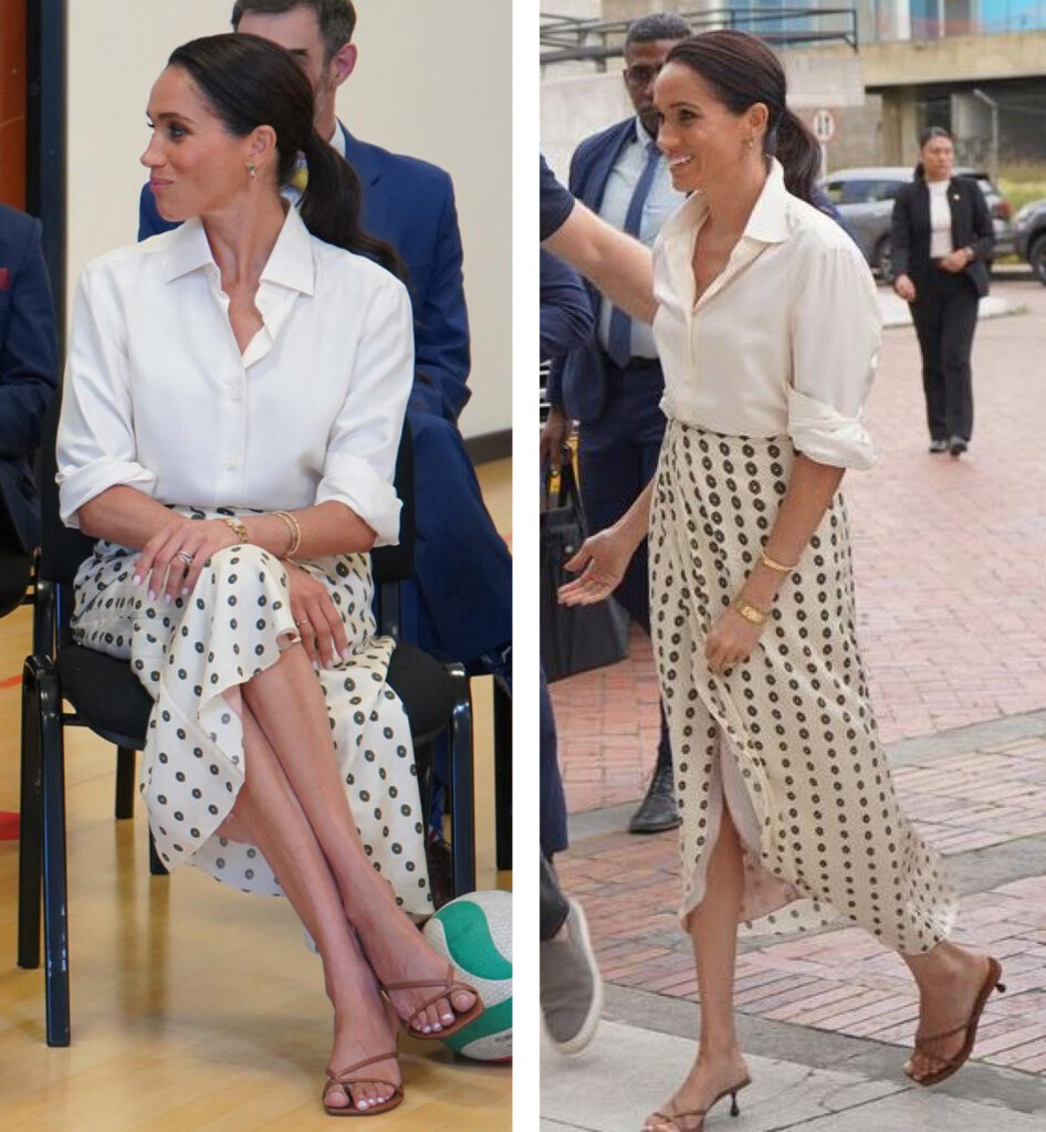 Meghan looked effortlessly chic in a crisp white button-down shirt from Giuliva Heritage tucked into a cream maxi skirt from Colombian designer Juan De Dios. She completed the ensemble with brown Jimmy Choo sandals and delicate gold earrings by Ecksand.