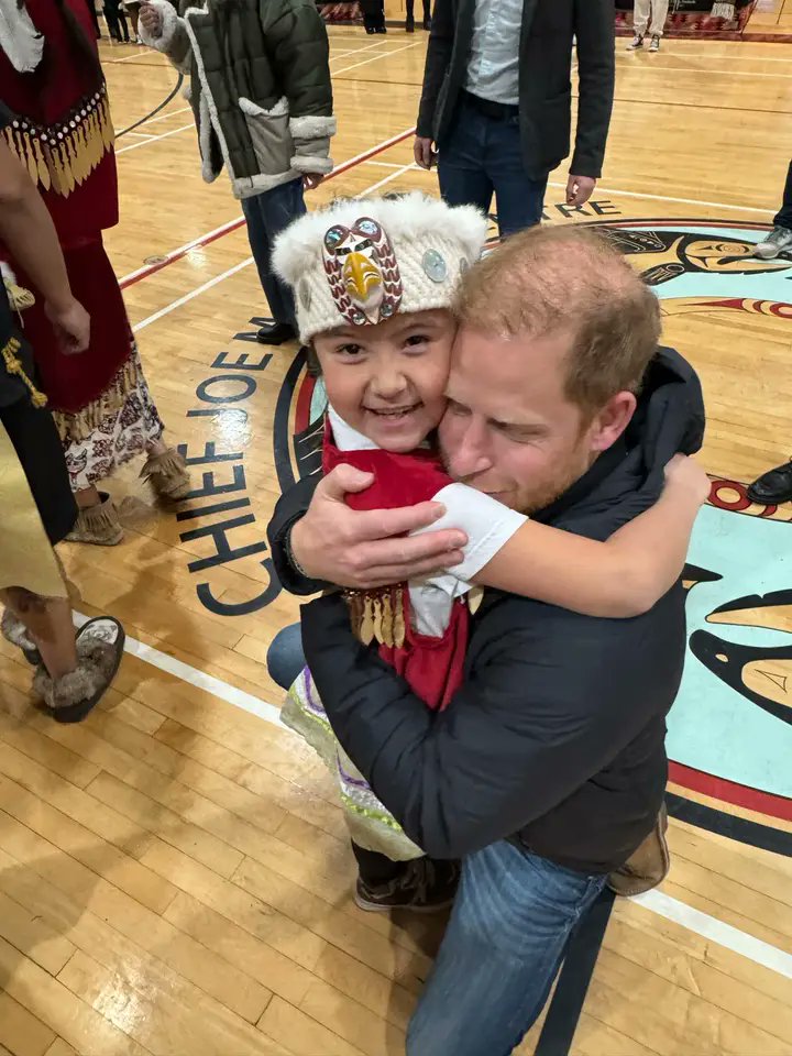 Harry embraces a young Squamish Nation girl who was just thrilled to meet him and Meghan.
