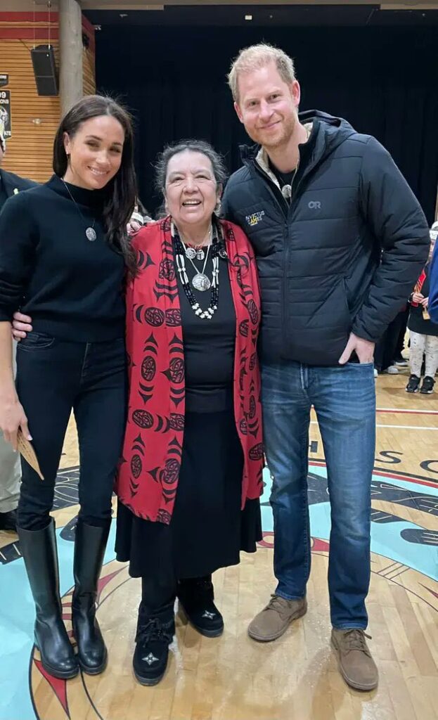 Below, Harry and Meghan with Sempulyan Gonzalez, General Councilor at Squamish Nation.