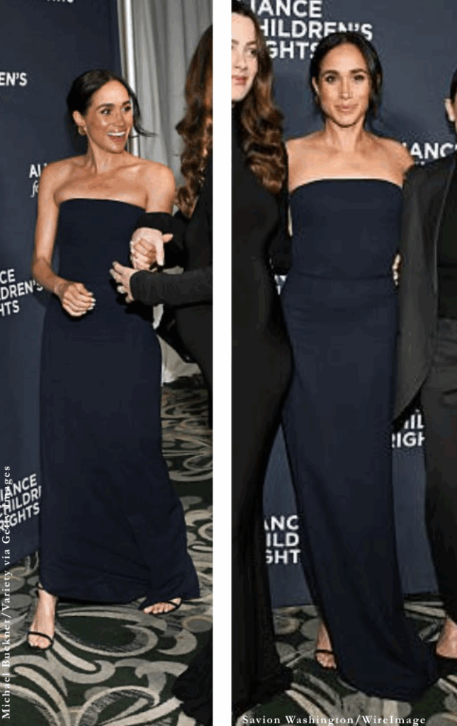 Meghan stepped out tonight for the Alliance for Children’s Rights event in Beverly Hills. She wore a navy strapless gown from Ralph Lauren. Simple yet elegant. She pared it with black sandals from Stuart Weitzman.