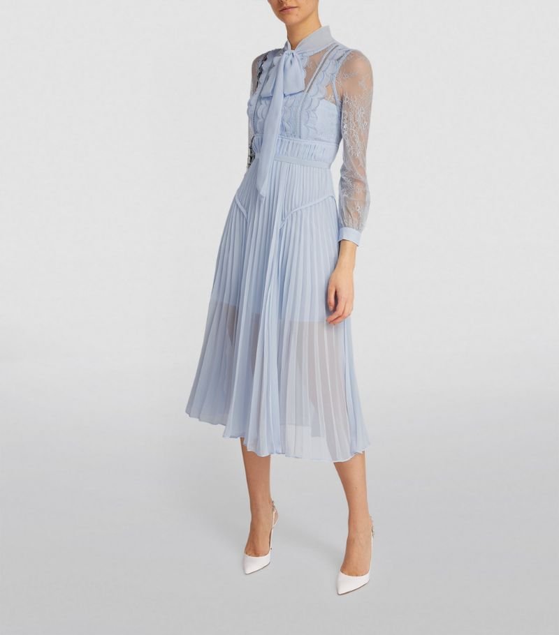 She is wearing a chiffon and lace dress from Self-Portrait.
