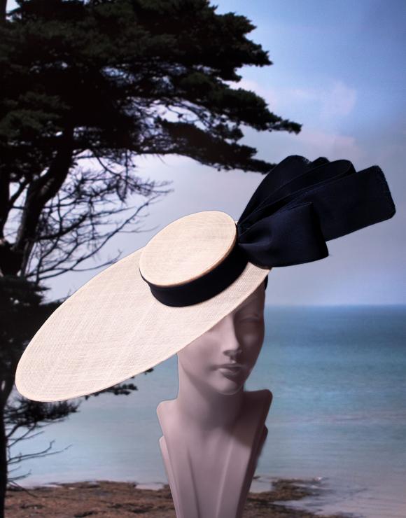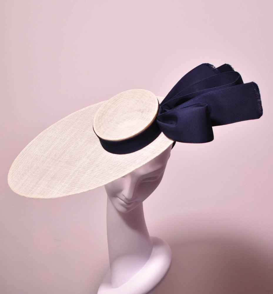 The Duchess is wearing a hat by milliner Stephen Jones. It is the designer’s ‘Granville’ style in white with a navy bow.