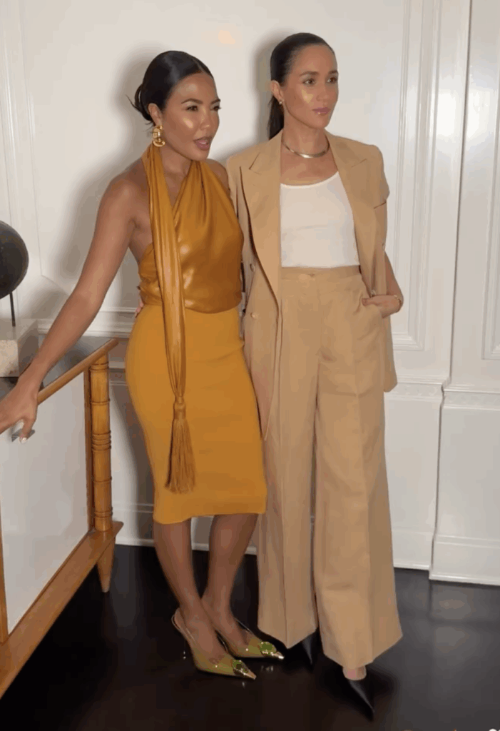 For the dinner, Meghan opted for a chic tan two-piece suit paired with a white top. She accessorized with her gold collar necklace by Aurate and completed the look with pointed-toe black Balenciaga heels. Her hair was styled in a sleek, pulled-back look, and she kept her makeup natural and glowing — a signature of her polished yet approachable style.