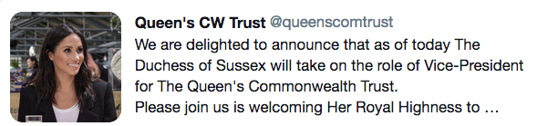 Today’s other news: Meghan has been named Vice President of the Queen’s Commonwealth Trust. More from The Trust: