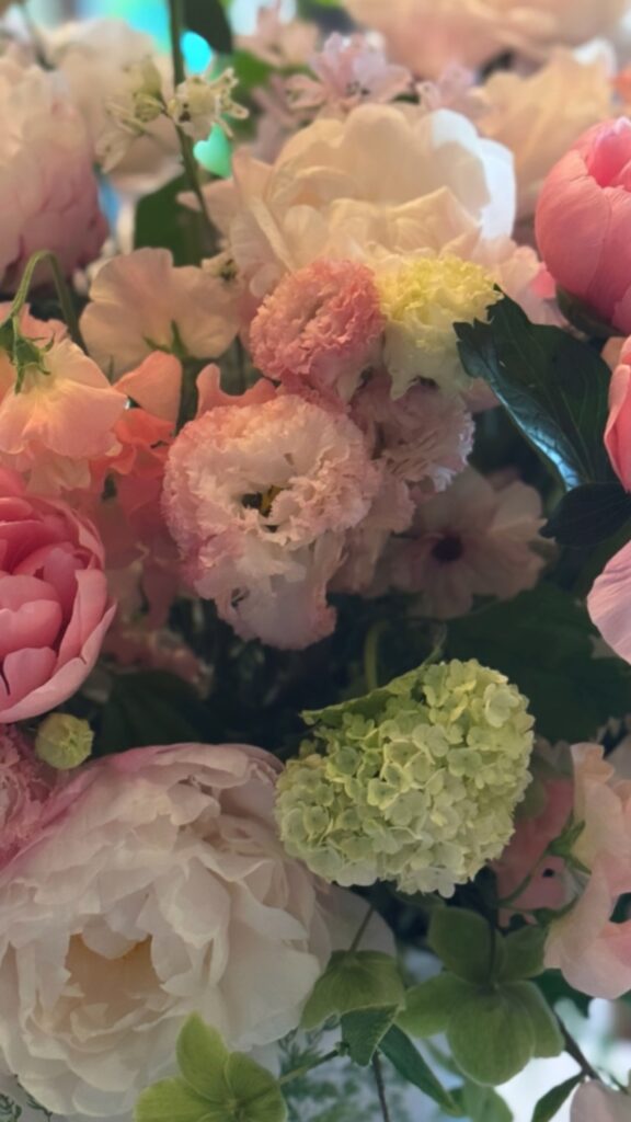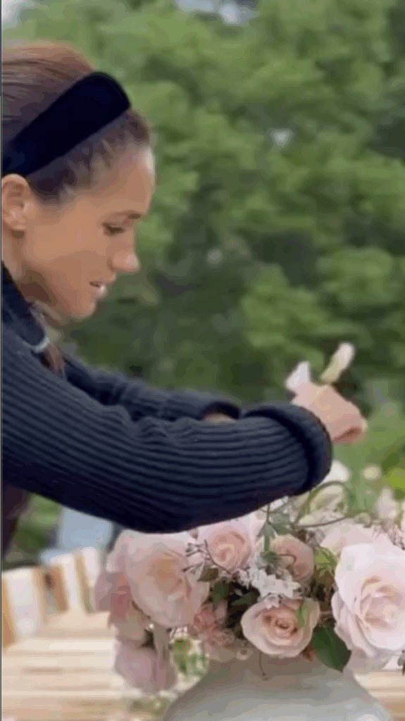 In the next moment, Meghan appears to reach for what looks like wisteria as she continues arranging the flowers.