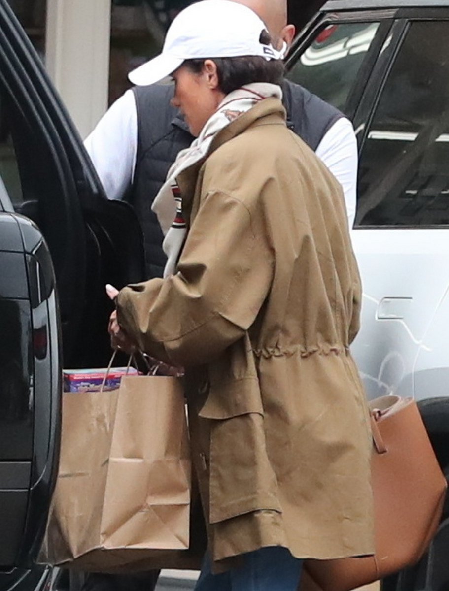 We could not get a good look at the sweater and jeans that she had on. Meghan completed the look with a white baseball cap.