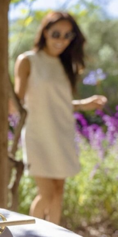 In the last photo Meghan is seen wearing a shift dress with a high neck.