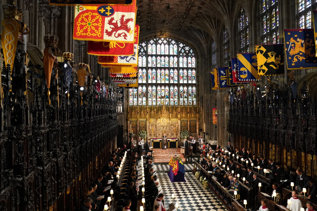 The Queen’s beloved Corgis, Muick and Sandy, await the Queen’s coffin arrival at St. George’s Chapel.