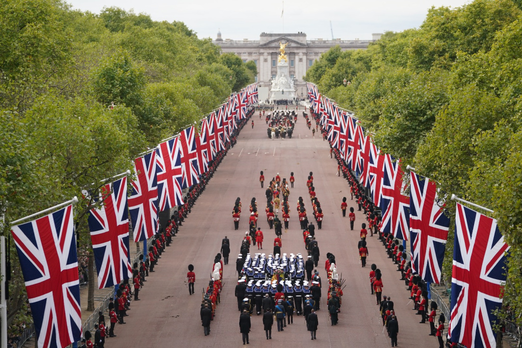 Below the Queen’s coffin is carried into Westminster Abbey followed by the royal family.