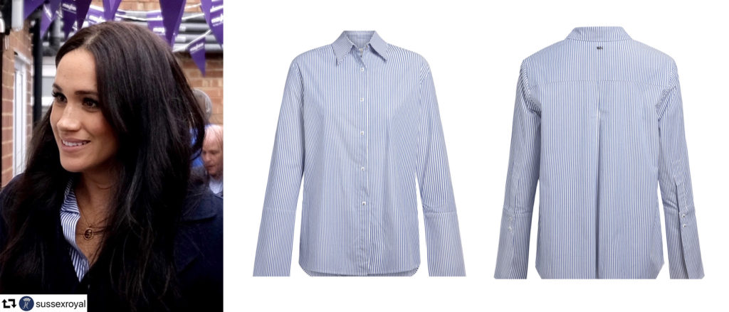 She wore a similar striped shirt from Misha Nonoo – the Husband style in blue stripe, $255 back in 2020 during her visit to the Mayhew. This is not the one she wore yesterday though as the stripes don’t match.