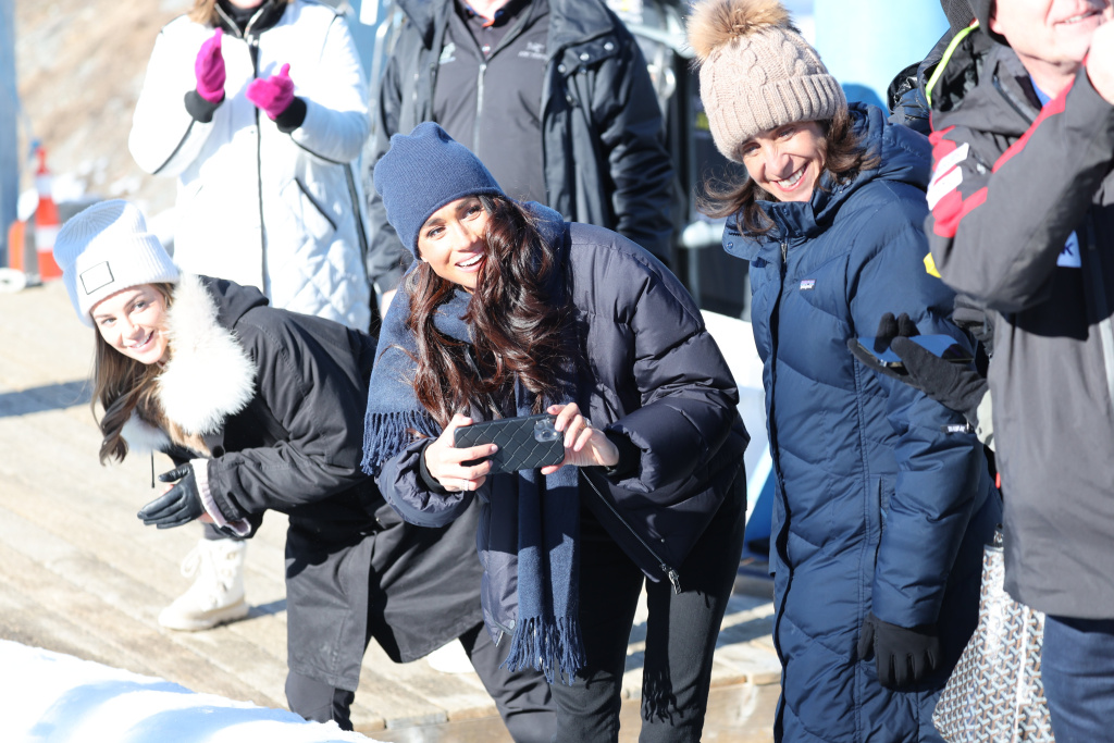 The Duchess was spotted on the sidelines, radiating excitement as she recorded her husband, Prince Harry, participating in the skeleton activity with members of participating nations.