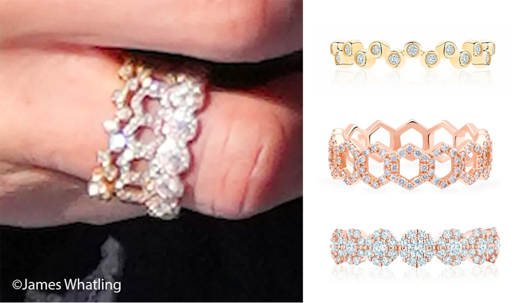 Upon removing her gloves, we spotted her Birks stacking rings – the Snowflake diamond ring, $6600, the Bee Chic, $3850, and the Splash ring, $1850.