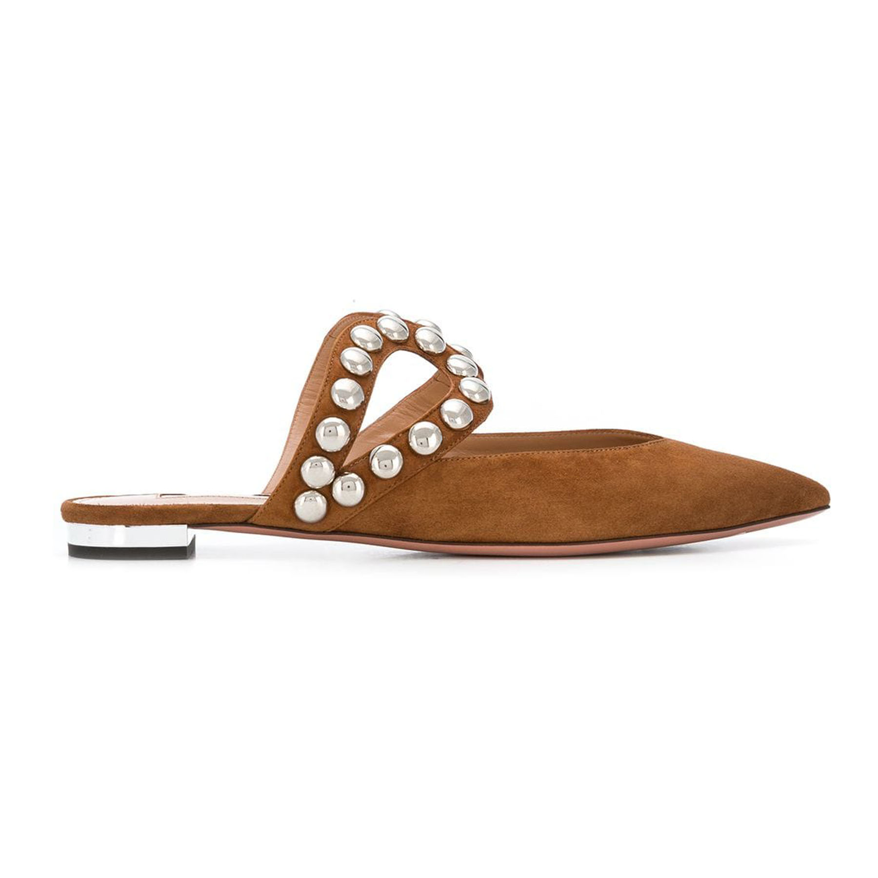 The shoe Dj Slide. Crafted in Italy from ‘buttery’ suede in cinnamon brown, the pair is embellished with round metallic studs at the upper and finished with our signature metallic heel for added flair. Retail $ 750