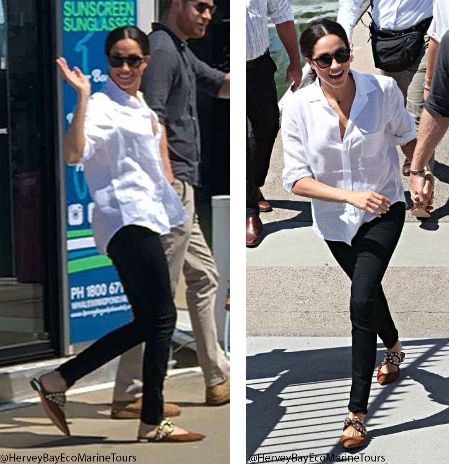 Meghan wore the Aquazzura ‘Dj’ Slide in cinnamon brown suede with metallic studs as the couple were leaving Fraser Island, Australia on their way to Fiji, October 2018.