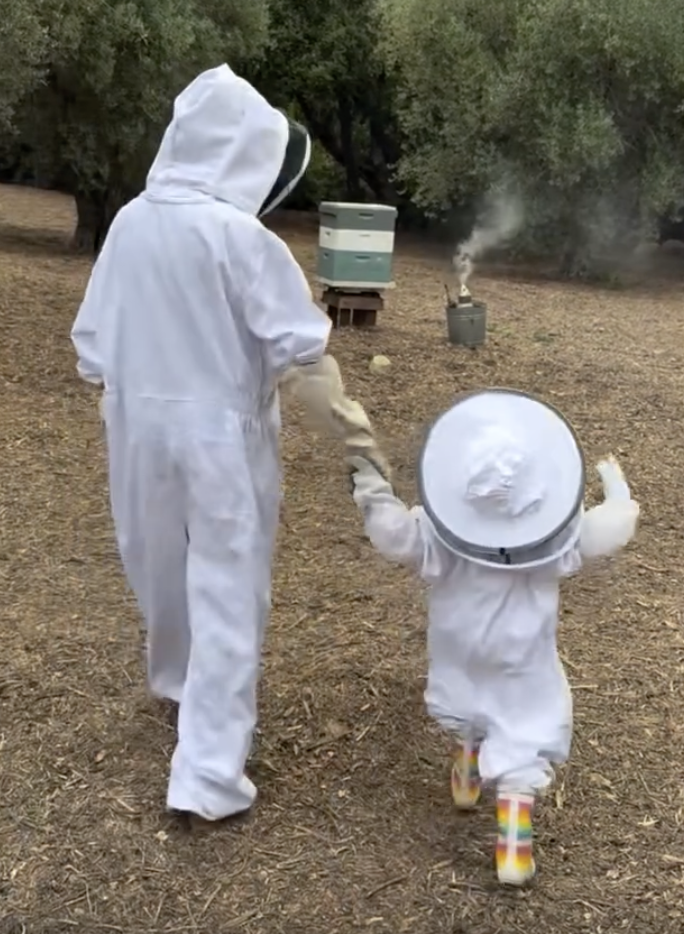 In the video, Meghan and Lili are seen walking over to the family’s bee hives, suited up for the occasion. And let me tell you—Lili was the cutest “mini-me” imaginable! Clad in her very own pint-sized bee suit, a pair of cheerful rainbow rain boots, and—adorably—borrowing Mom’s gloves, she looked every bit the part of a budding beekeeper.