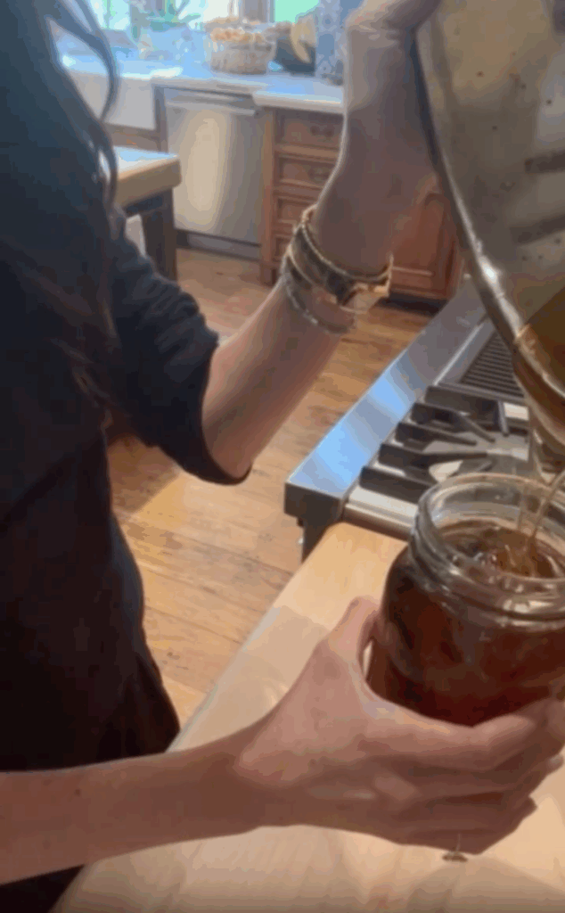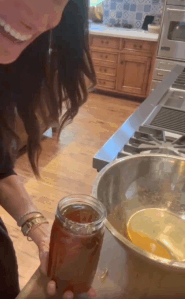 The clip continues into the kitchen, where Meghan is seen cutting pieces of honeycomb and jarring fresh honey. She wore a sleeveless black J.Crew cashmere sweater (a timeless classic!) paired with what appears to be black knit pants—a simple, polished look that felt perfectly at home in a California kitchen moment.