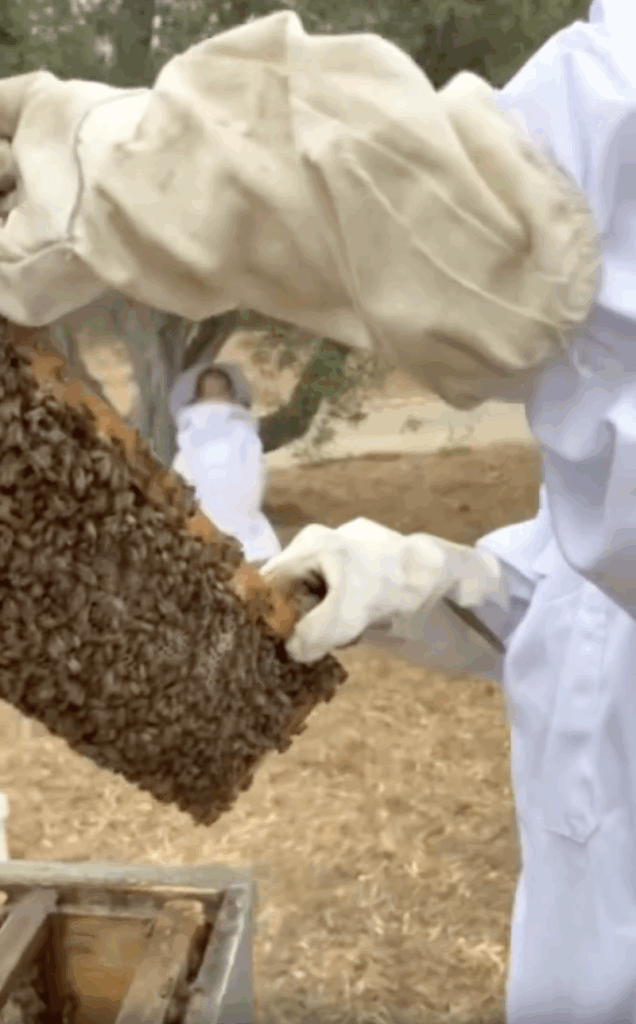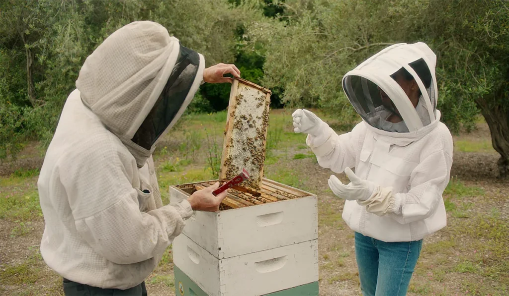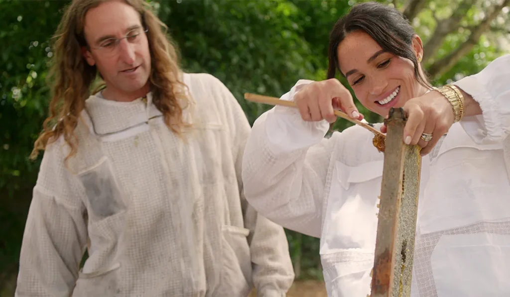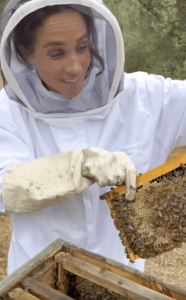 Inside the hives, the duo collects fresh honeycomb—a tactile, natural connection to the land and a nod to sustainability, a cause close to Meghan’s heart.