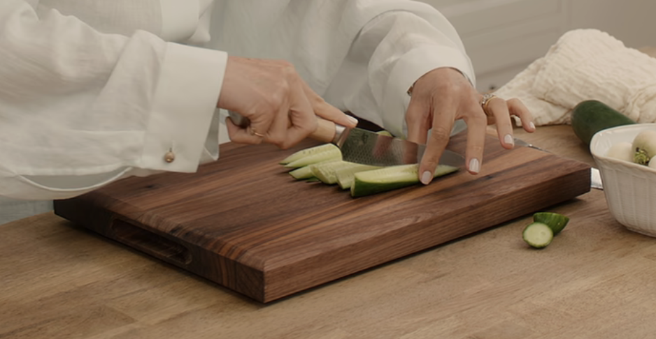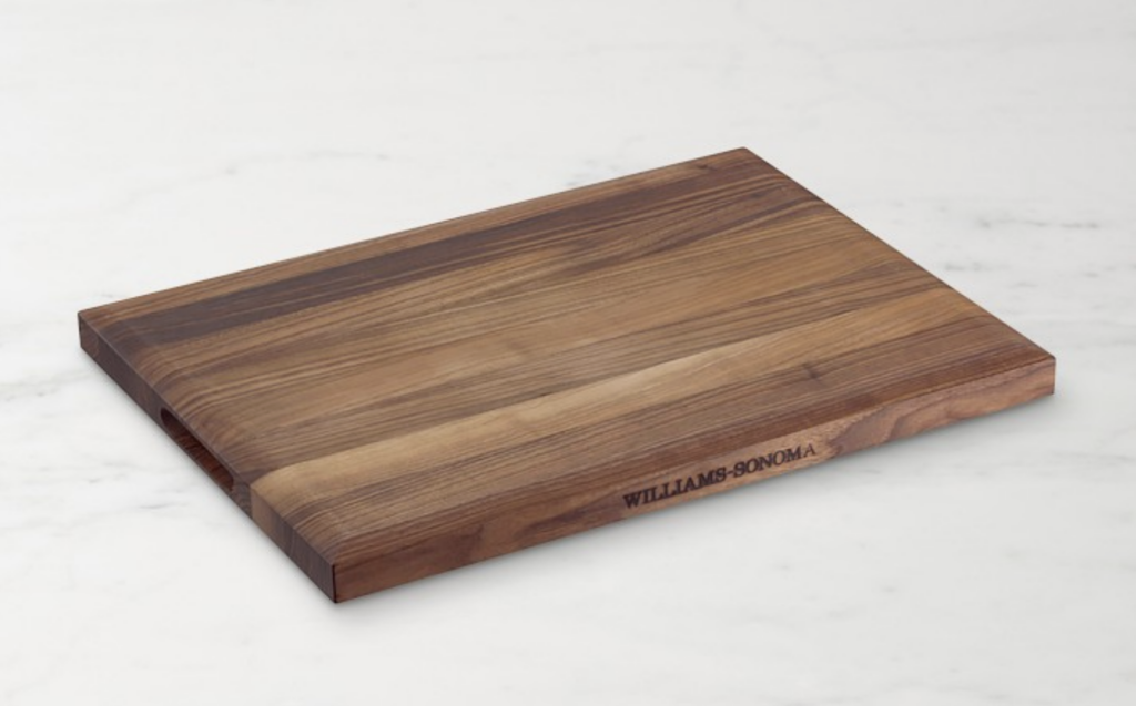 The cutting board she she uses is from William-Sonoma – Rectangular Cutting & Carving Board with Feet, Walnut, $350.