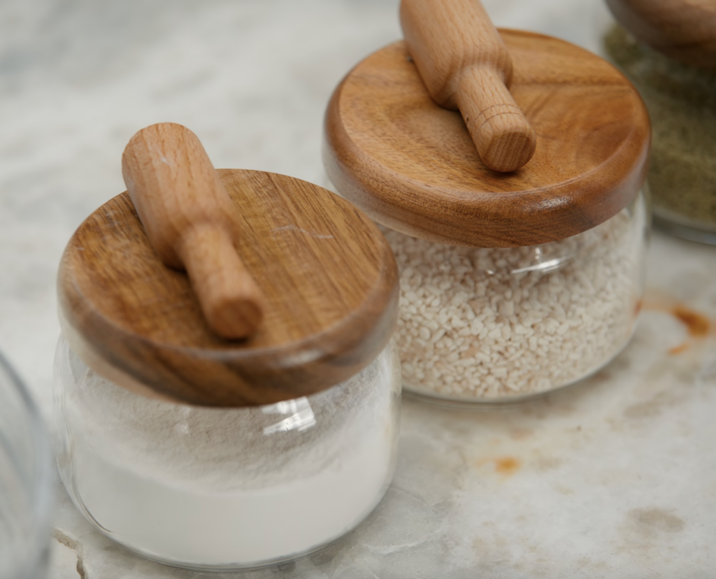 Here are a few options for similar items — Glass storage containers with wood lids, $14. You can buy the little wooden scoops in packs of 5, $4 or packs of 12, $9.
