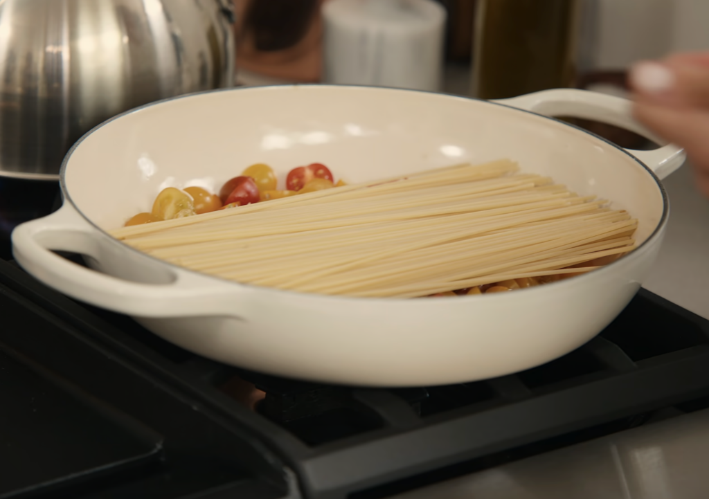 The braising pan used in a several scenes is from Le Creuset – the Signature Braiser in Brioche, $368 (currently only the 3.5 qt is available in this colorway). It is available currently on William Sonoma here.